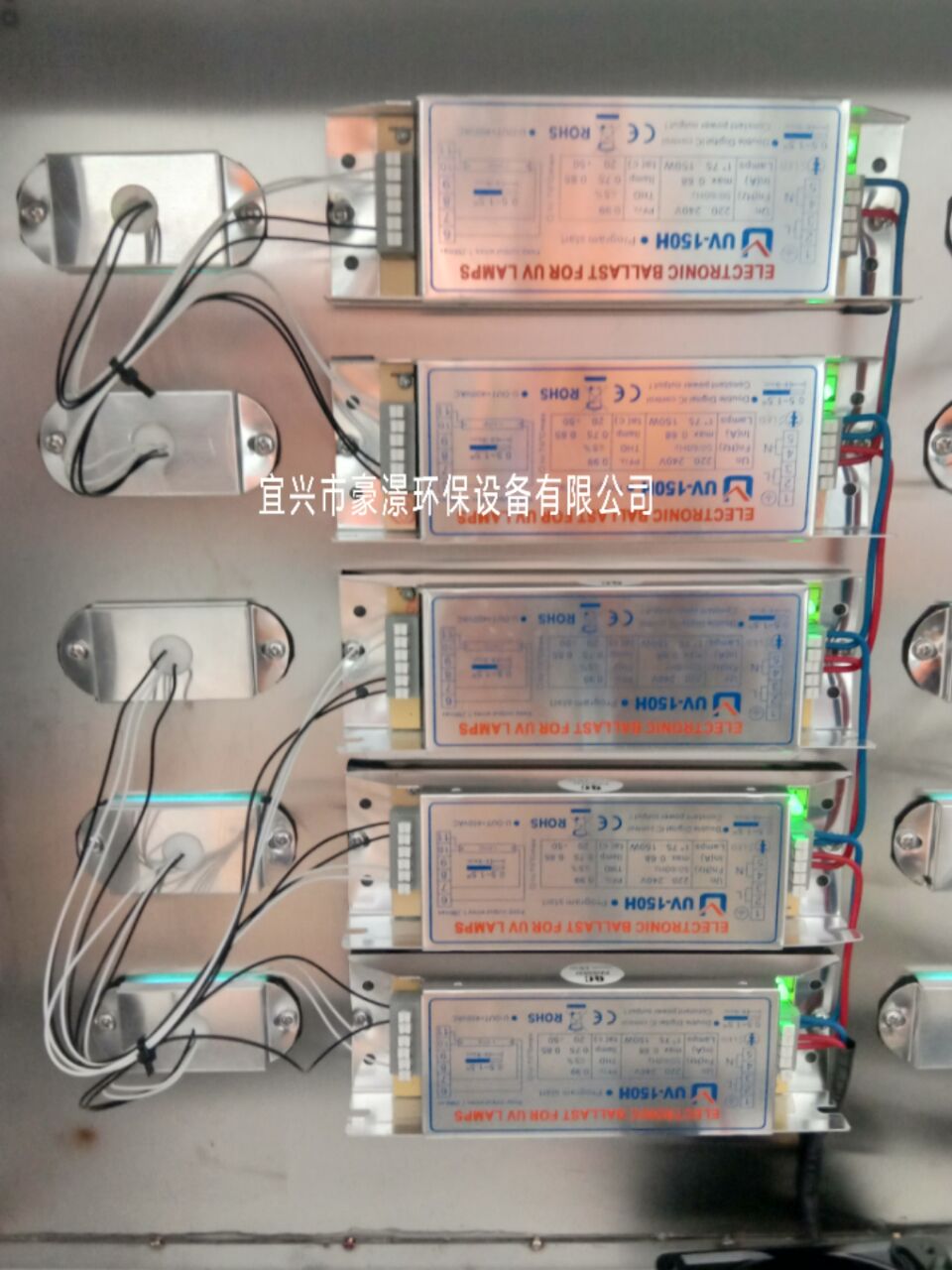 3)恶臭气体利用排风设备输入到本净化设备后,净化设备运用高能UV紫外线光束及臭氧对恶臭气体进行协同分解氧化反应,使恶臭气体物质其降解转化成低分子化合物,水和二氧化碳,在通过排风管道排出室外。