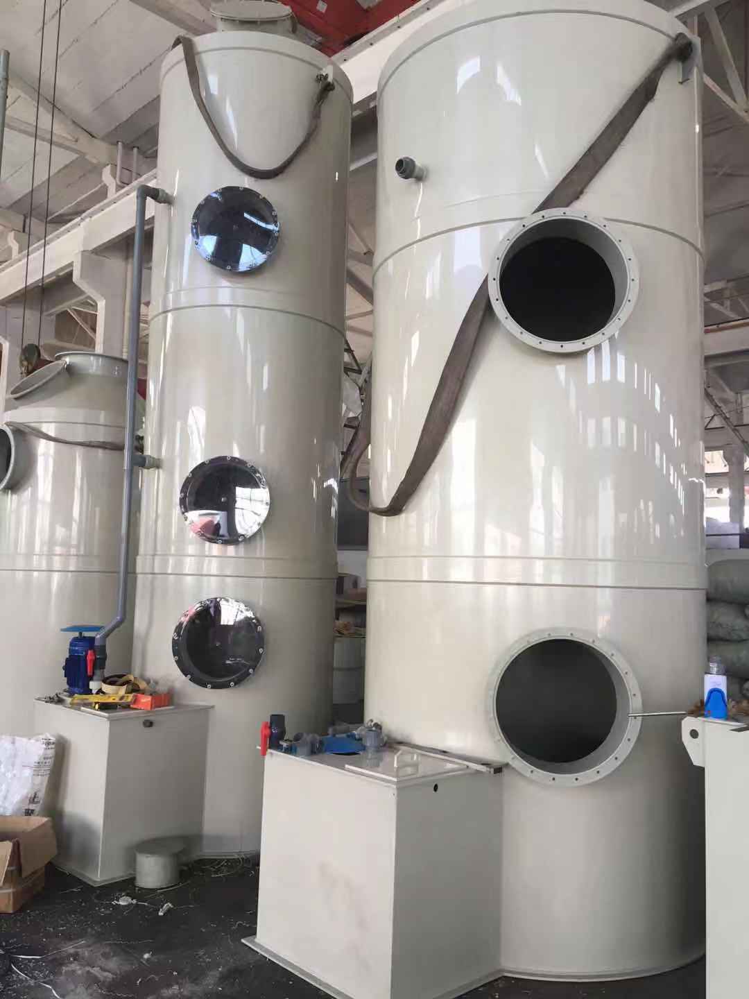 PP洗涤塔是一种新型的工业废气处理处理设备。它是在可浮动填料层工业废气净化器的基础上改进而产生的,广泛应用于工业废气处理、除尘等方面的前处理,净化效果很好,是目前酸碱废气处理中超常用也超实用的一款处理设备。我司生产的PP洗涤塔与市面上现有的洗涤塔不同,它是由塑料之中超轻的聚丙烯,也就是PP材料制作而成,我司生产的洗涤塔主要分为两种:填料塔和旋流塔,而填料塔相对应用广泛,当废气中粉尘较多时,可选用旋流塔。PP洗涤塔具有结构简单、能耗低、净化效率高的特点,能有效去除氯化氢气体(HCl)、氟化氢气体(HF)、氨气(NH3)、硫酸雾(H2SO4)、铬酸雾(CrO3)、氰氢酸气体(HCN)、碱蒸气(NaOH)、硫化氢气体(H2S)、福尔马林(HCHO)等水溶性气体。酸雾废气由风管引入净化塔,经过填料层,废气与氢氧化钠吸收液进行气液两相充分接触吸收中和反应,酸雾废气经过净化后,再经除雾板脱水除雾后由风机排入大气。吸收液在塔底经水泵增压后在塔顶喷淋而下,超后回流至塔底循环使用。净化后的酸雾废气达到排放标准。